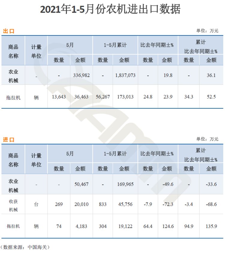 中國海關數據顯示,2021年1-5月,農業機械出口值183.7億元,同比增長36.1%,進口值17億元,同比下降33.6%。1-5月共出口拖拉機56267臺,同比增長34.3%;全年共進口拖拉機304臺,同比增長94.9%,進口收獲機械833臺,同比下降3.4%。